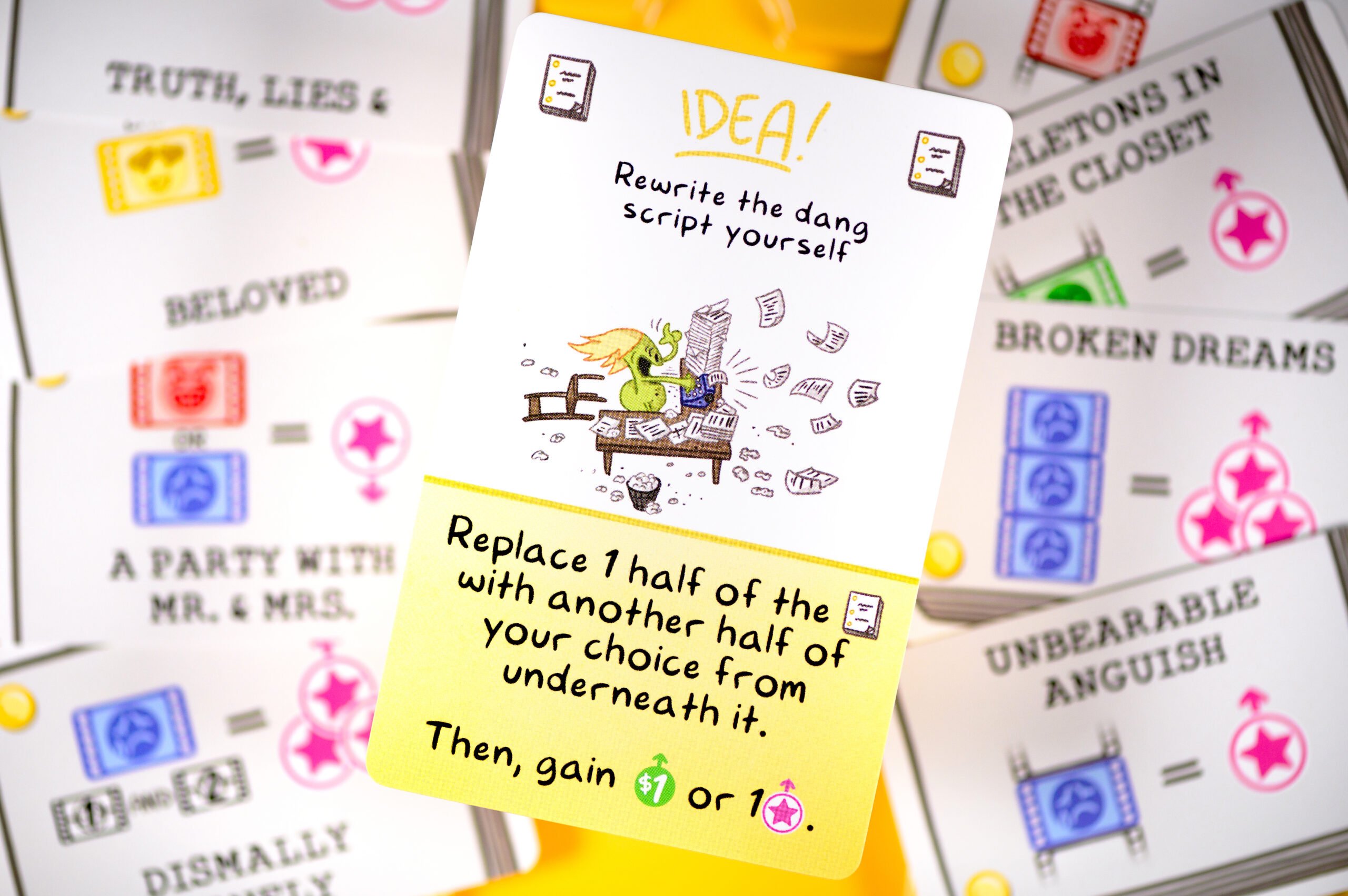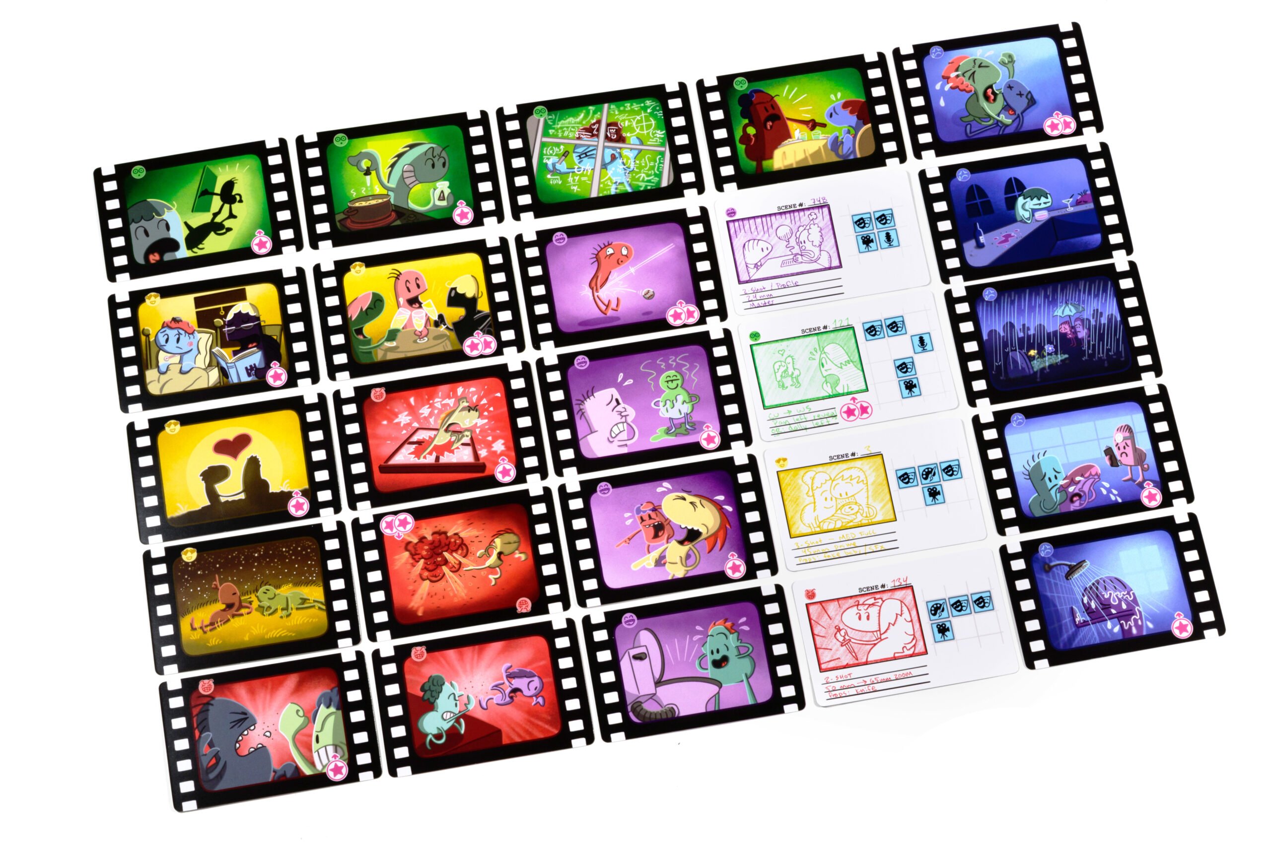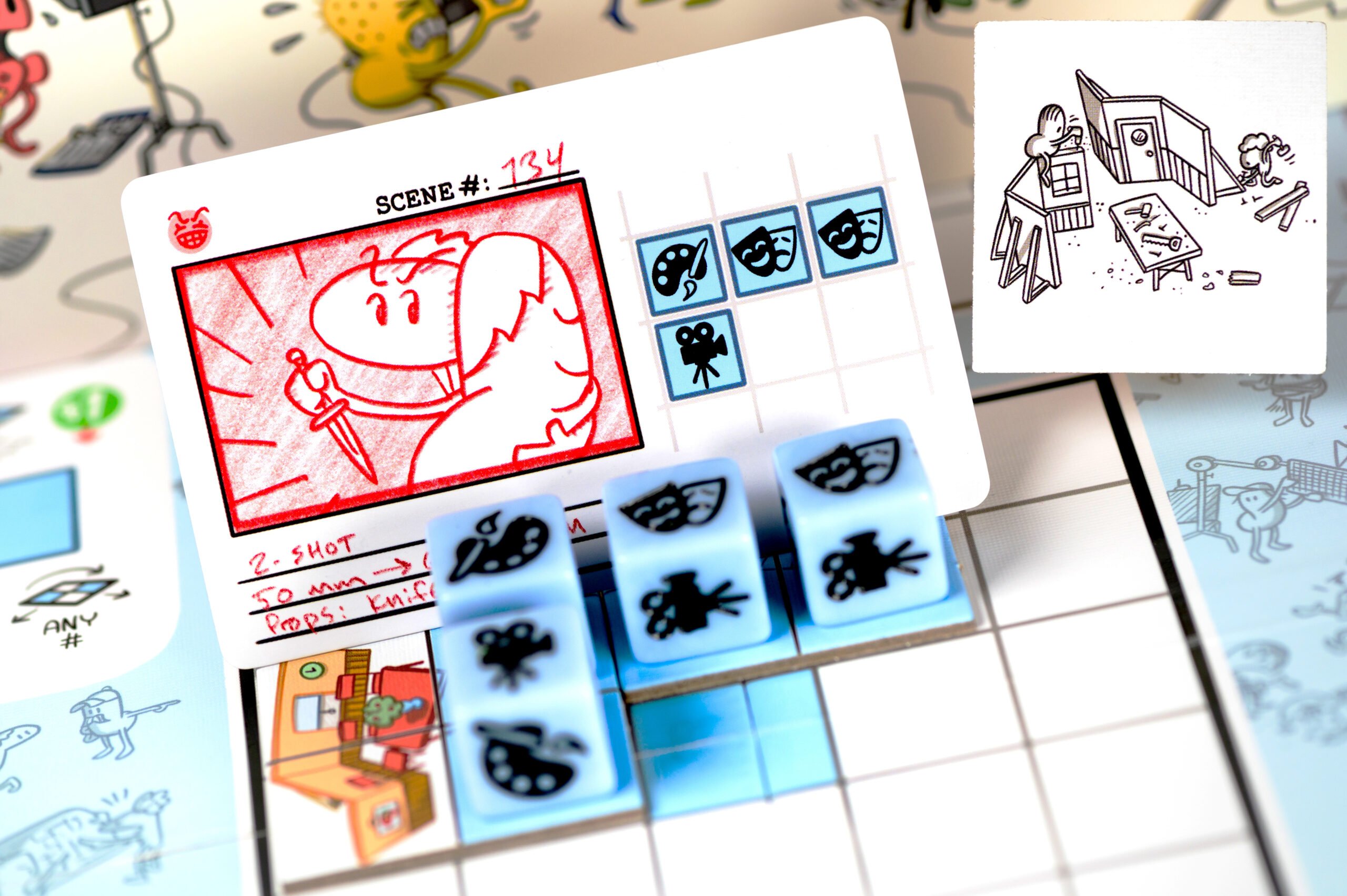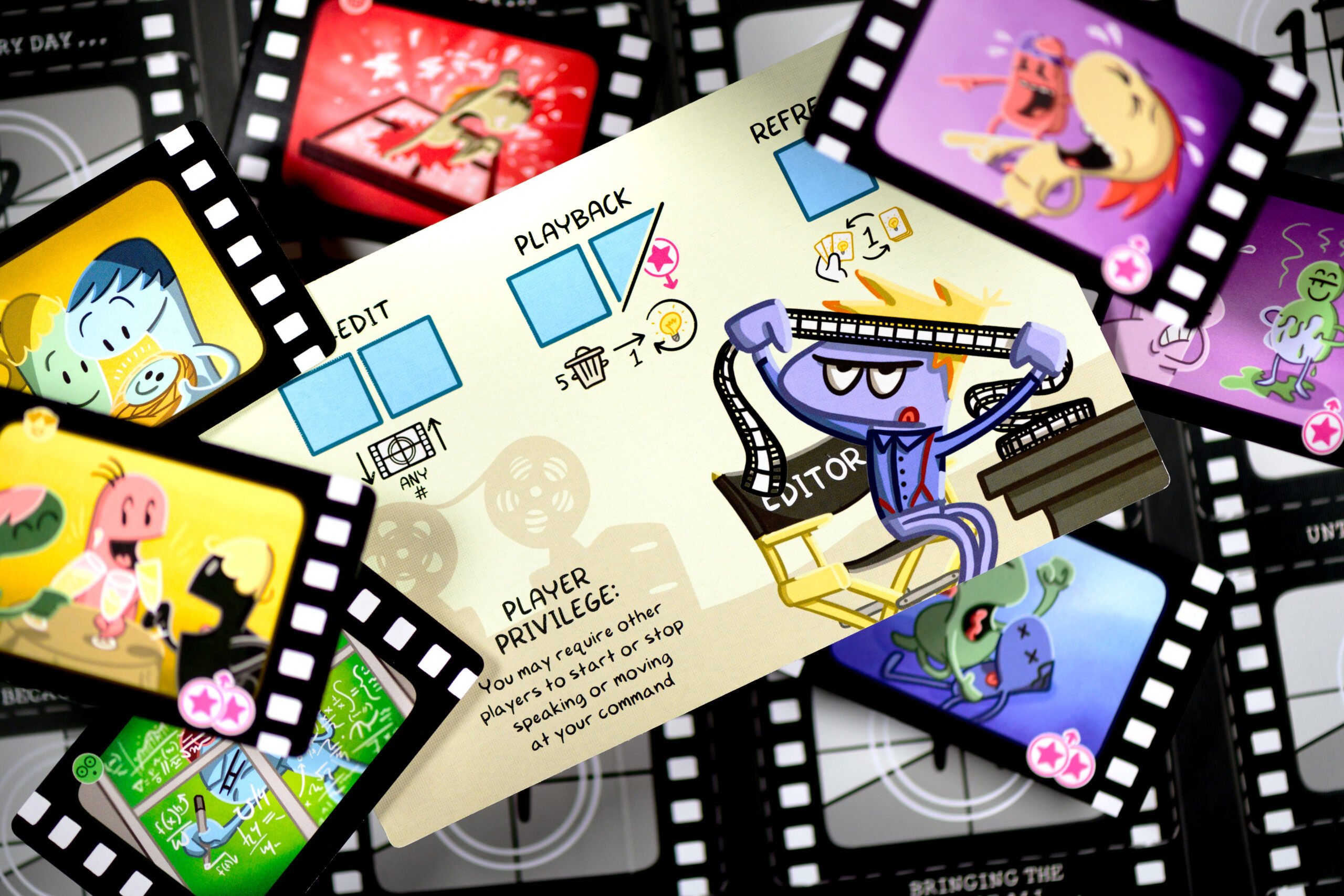 Cada uno tomará el papel de responsable del departamento de un área. En tu turno tendrás que asignar a tu equipo de grabación en las diferentes acciones del tablero, tu tablero personal o en el set de rodaje para rodar las Escenas. Lo malo es que un montón de Problemas os acechan, así que organiza reuniones de producción para proponer grandes Ideas.
