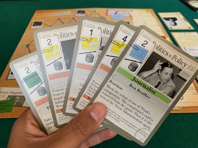 En WATERGATE, un jugador asumirá el papel de un editor del periódico, mientras que el otro encarnará la administración Nixon – y cada jugador tendrá un juego de cartas diferente. Para ganar, la Administración Nixon deberá recabar el apoyo suficiente para aguantar hasta el final del mandato, mientras que el editor deberá reunir suficientes pruebas para conectar dos confidentes con el presidente de forma directa. Por supuesto, la administración hará todo lo posible en su poder para ocultar esas pruebas. ¿Podrá el confidente conocido como «Garganta Profunda» inclinar la balanza? Comienza una emocionante carrera contrarreloj…